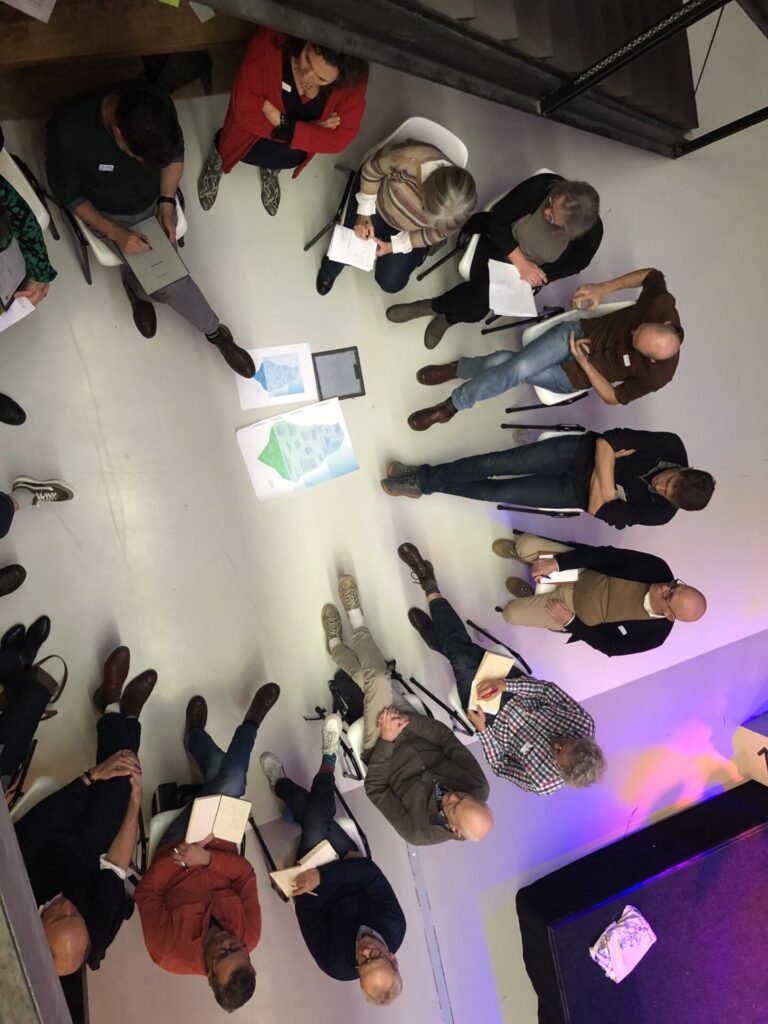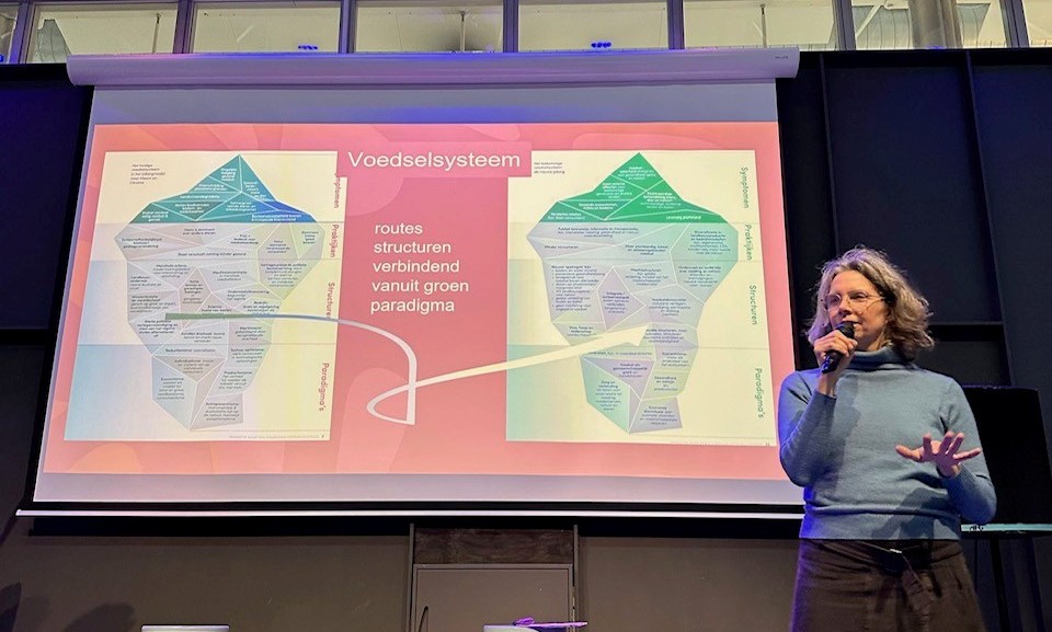 Op 9 december experimenteerden we in een interactieve sessie met de ‘blauwe’ ijsberg (het dominante voedselsysteem) en de ‘groene’ ijsberg (het gewenste systeem waar voedselinitiatieven deel van uitmaken), ontwikkeld door o.a. Bram van Helvoirt van de HAS in Tilburg. Doel was te leren van voorbeeldstructuren die in de groene ijsberg ontstaan vanuit andere overtuigingen (paradigma), met andere praktijken en andere symptomen.